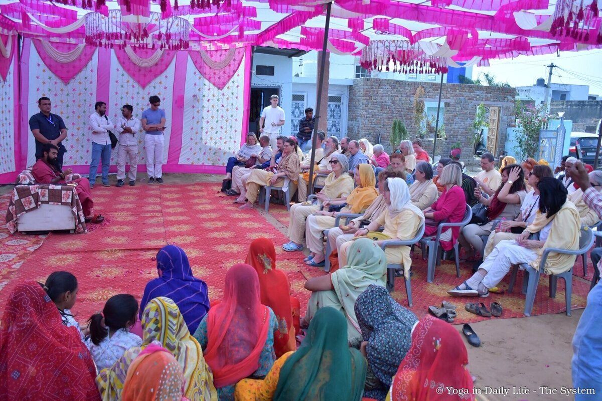 On the return journey to OM Ashram, devotees in Alatwa warmly welcomed Pujya Maharaj Ji and the travelling bhaktas. A short satsang and joyful bhajans created a beautiful atmosphere, allowing international devotees to experience traditional Indian village devotion firsthand.
